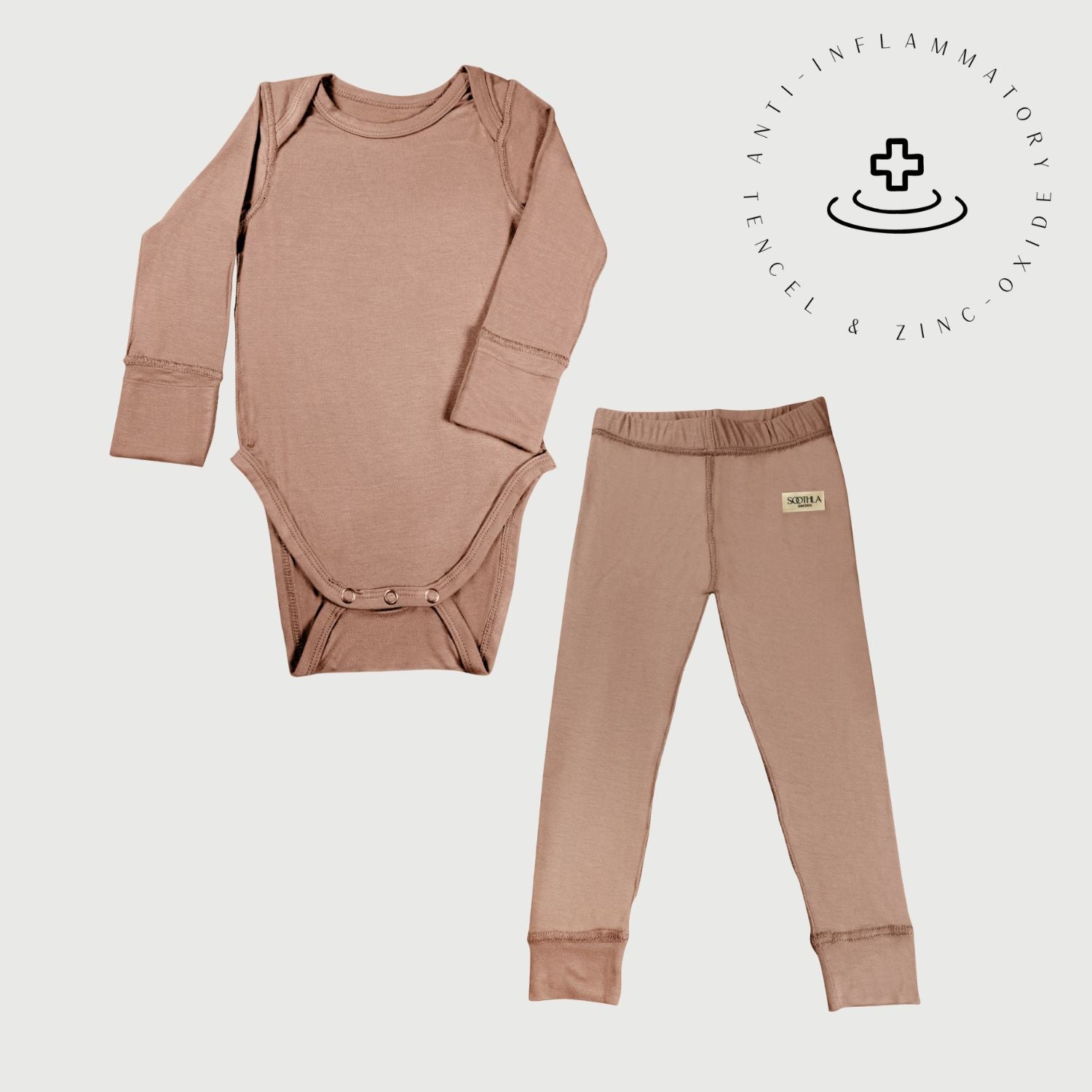 Matchande set med Baby body och Leggings. Designade för att vara skonsamma mot känslig hud och eksem. Baby bodyn har omlottlagda axlar för enkel påklädning och vikbara vantar för att hindra rivande. UV-skydd upp till 50 SPF+.